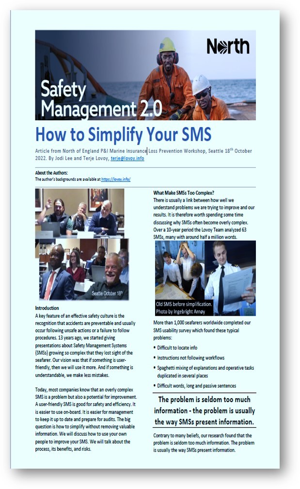 IMPA invited Lovoy to share experiences from making maritime management systems more user-friendly. The article “The Language of Human Centered Safety” captures essential parts of Terje Lovoy’s presentation. It explores common assumptions about writing regulatory-compliant text. The Language presentation. The article shares the real root causes for why SMSs often become overly complicated. It is relevant for anyone involved in writing any kind of text to meet regulations and improve safety.