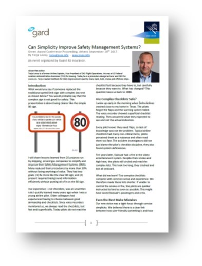 Accessible, airline checklists, airline procedures, average words per sentence, aviation checklists, aviation procedures, break the vicious cycle of complexity, bridge resources management, BRM, BSM checklists, BSM procedures, checklist design, checklist risk assessments, checklist simplification, checklists are not training devices, checklists to prevent accidents, chunking, class societies, coast guard regulations, cockpit resource management, company resources management, complex checklists, complex procedure, complexity is a vicious cycle, compliance mindset, cover you back exercise, crew resource management, CRM, Det Norske Veritas (DNV), DNV GL, flag state, good tools – half the job, graphic presentation, HSSEQ Manager, human element, human error can be controlled, human error, human factors, identifiable steps, International Convention for the Safety of Life at Sea, International Safety Management Code, Intertanko, ISM code, ITSOF, lack of competence, logic manner, Lovoy AS, marine accidents, marine accident rates, marine checklist, marine losses, marine procedures, maritime safety, maritime services, maritime surveyor, OCIMF, Oil Companies International Maritime Forum, overly complex SMS, plain English, plain language, prevent the checklist from becoming too long, proactive checklists, proactive procedures, proactive SMS, procedure design, Procedure risk assessments, procedure simplification, procedure vicious cycle, process oriented procedures, process, prose text, readability, reduce accidents caused by human error, resilience, risk based checklists, risk based procedures, risk based SMS, root cause, safe ship, safety culture, safety management system, seafarer accident rates, seafarer safety, seaman dying, seaman mortality, seamen accidents, seamen safety, ship management companies, ship security, simple concise checklists used by pilots, simplified technical English, simplify and clarify, SMS improvement, SMS risk assessments, SMS simplification, SMS vicious cycle, SMS, step-by-step procedures, sufficient details, Tanker Management and Self Assessment, team management, Terje Lovoy, Terje Løvøy, text washing, TMSA 3, too long checklists, training and standardization, United States Coast Guard quarterly magazine Proceedings, USCG, verification points, vetting, workflow, workflow-based procedures.